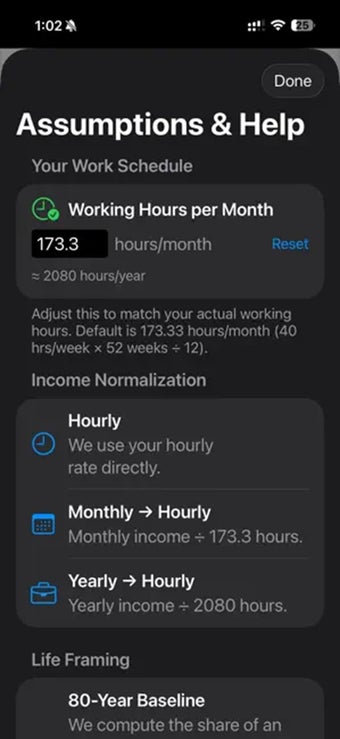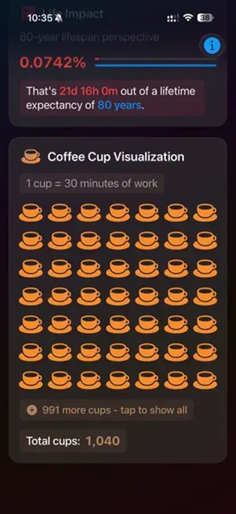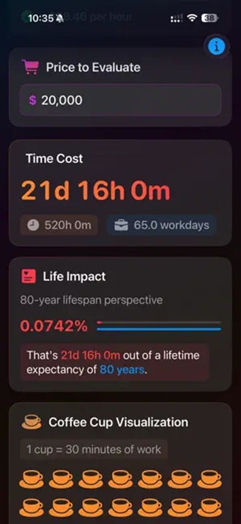 Puedes ver tus costos a través de una visualización de tazas de café, donde cada taza representa treinta minutos de trabajo. La aplicación también cuenta con una herramienta de impacto en la vida que rastrea qué porcentaje de una vida estándar ocupa una compra. Aunque es efectiva para replantear el gasto en términos de tiempo, la aplicación carece de herramientas de presupuesto integradas o rastreadores de ahorros, limitando su uso para los usuarios que buscan características de planificación financiera más amplias.
